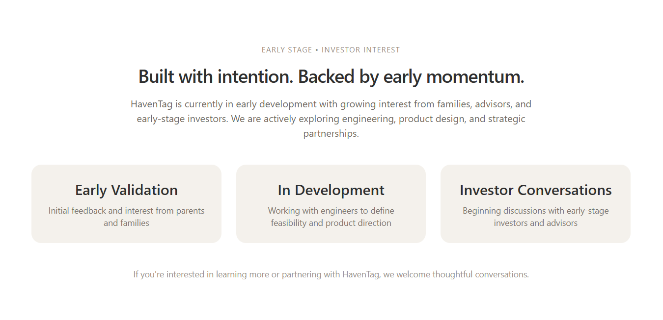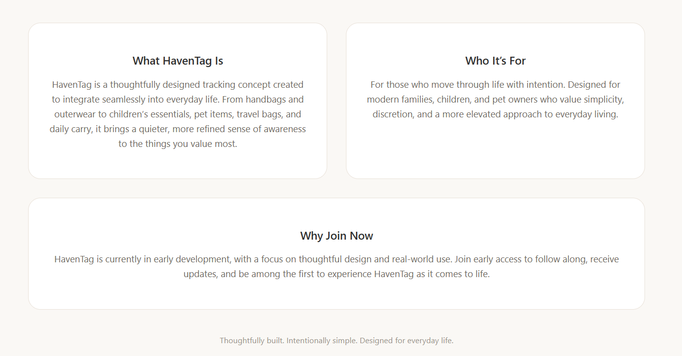 HavenTagA simple, modern way to keep track of everyday essentialsBuilt for families, travel, and daily life Join Early Access Be the first to experience HavenTag Email Address Sign Up Thank you!